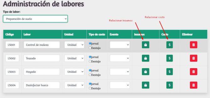 A una labor se le debe configurar en caso de ser necesario los insumos necesarios para realizar dicha labor. Dentro de los insumos pueden estar herramientas o maquinarias.